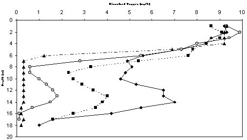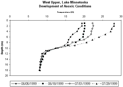Development of Stratification and Anoxic Conditions. Natural lakes located within temperature climates stratify as water temperature increases after ice-out. With the onset of stratification, the deepest and coldest layer of water, called the hypolimnion, within temperate productive lakes often becomes anoxic due to decomposition of organic matter. According to RUSS data, the development of anoxic conditions for Halsted Bay (approximately June 8, 1999) and Lake Independence (approximately May 11, 1999) coincided with the onset of stratification. However, the development of anoxic conditions within West Upper occurred substantially later than the onset of stratification (approximately April 30, 1999). Unexpectedly, we found that dissolved oxygen levels decreased below 8 m in depth, and then increased again as much as 2 mg/L at approximately 13 m in depth prior to decreasing again near the lake bottom (18 m in depth). This dissolved oxygen spike within the hypolimnion persisted until July 29, 1999. We are currently uncertain of the exact cause for the dissolved oxygen spike in the hypolimnion, and will be further investigated in the spring of 2000.