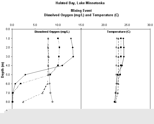 Development of Lake "Turn Over." During the autumn, the water temperatures begin to decrease, which reduces the density differences between the upper and lower layers. Eventually, wind mixes the water column causing a gradual decrease in temperature. When surface and bottom waters approach the same temperature and density, autumn winds can mix the entire lake causing "turn over." After continuous mixing of the water column, dissolved oxygen levels also becomes uniform concurrently with temperature. We found that Halsted Bay "turned over" approximately September 7, 1999, which coincided with the time period of the second mixing event reference above (review development of lake stratification and anoxic conditions). Apparently, the shallow basin did not re-stratify because of continuous mixing. Lake Independence and West Upper did not turn over until much later because it requires more wind energy to mix these deeper basins. Unfortunately, we were uncertain of the exact time period that Lake Independence "turned over" because data was not collected continuously due to complications with the RUSS unit. However, non-continuous data suggested that "turn over" occurred between September 22 and October 1, 1999. Shortly after dissolved oxygen and temperature levels became uniform within Lake Independence, the thermocline began to gradually deepen for the West Upper basin, Lake Minnetonka. We found that the West Upper basin did not completely "turn over" until October 22, 1999.