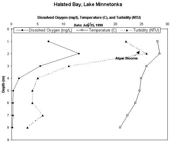 The development of anoxic conditions in the hypolimnion causes a nutrient (e.g. phosphorus and nitrogen) release from the bottom sediments. In relatively deep basins, these nutrients often become entrapped within the hypolimnion due to stratification, and most likely are not available for algae production. RUSS data indicated that there were no significant changes in stratification within West Upper and Lake Independence throughout the summer. However, nutrients released from the bottom sediments can become available to algae in relatively shallow basins due to wind mixing events that eventually degrade stratification (called internal loading). We found that the Halsted Bay RUSS unit recorded two unexpected incidences in which temperature and dissolved oxygen became uniform throughout the water column (August 29 and September 5, 1999). We speculate these mixing events within Halsted Bay were conducive to internal loading. Those nutrients that became available from mixing events resulted in algae blooms in Halsted Bay.