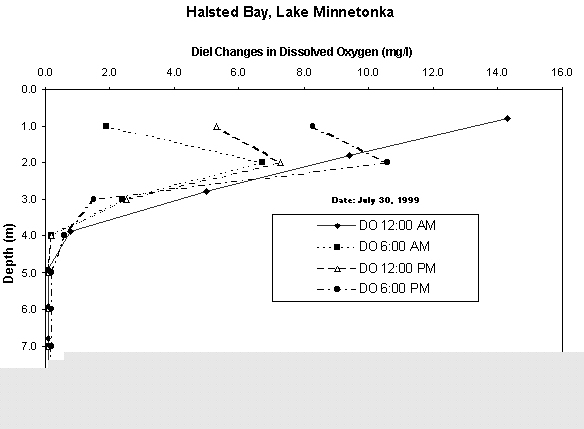 Excessive algae blooms can cause diel changes in dissolved oxygen due to photosynthetic activity. According to RUSS data, we observed diel changes in dissolved oxygen within Halsted Bay on July 30, 1999. Dissolved oxygen levels tended to increase during daytime hours due to plant photosynthesis, and decrease during the nighttime hours due to plant respiration.