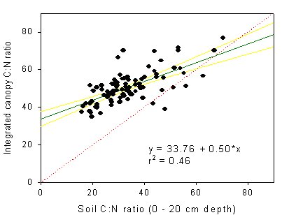 Figure 1. Canopy C:N Ratio (Weighted by Species and Needle Age Classes) is Linearly Related to Soil C:N Ratio. The dotted line indicates 1:1 relationship.