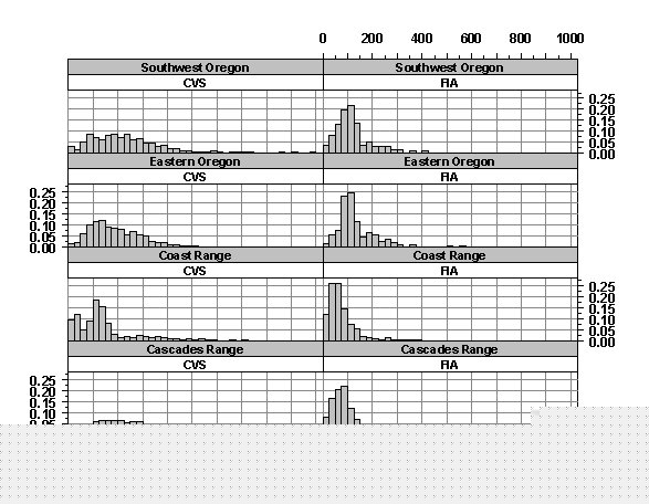 Figure 2. Frequency Distributions of Stand Age by Geographic and Data Type. Forests in western OR tend to have fewer old stands on non-federal FIA lands than on federal, CVS lands. This trend is apparent in all geographic areas and may reflect forest management practices on non-federal lands that tend to have short rotation periods of 50 to 100 years.