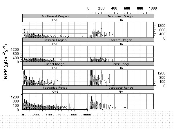 We are preparing a paper on Forest Inventory and Analysis (FIA) and Current Vegetation Survey (CVS) inventory data, entitled "How carbon fluxes and storage vary across OR forests-an assessment with inventory and intensive plot data." Using a combination of forest inventory data, intensive inventory sites, and remote sensing, we estimated forest biomass and net primary production for the forested region of OR. Plot level forest inventory data were provided by the U.S. Department of Agriculture Forest Service through their FIA (1,100 plots) and CVS (4,300 plots) programs. Stand age ranged from 0 to 750 years across the study area. The forest age distributions differed by geographic location with fewer old stands in coastal and eastern OR, and a relatively even distribution of ages from 0 to 750 in the Cascade Mountains (see Figure 2). Interestingly, age distribution differed by land ownership, with fewer old stands on federal lands than on non-federal lands across the entire study area. Forest biomass increased steeply in early development with the trajectory leveling out at about 200 years. Peak biomass generally was lower in eastern OR than in other areas (median biomass at asymptote ~10,000 g cm-2 and ~30,000 g cm-2 respectively), possibly due to water availability constraints. The timing and magnitude of the peak in net primary productivity (NPP) varied by geographic location within the study area with high-productivity sites (coastal OR) exhibiting a relatively high peak (median NPP ~1,000 g cm-2 y-1) around 30 years and low-productivity sites (eastern OR) exhibiting a relatively low peak (median NPP ~250 g cm-2 y-1) between 80 and 100 years (see Figure 3). Productivity tended to decline after the peak and stabilize at about 50 percent of the peak by about age 200. Measurements of additional carbon budget components combined with inventory data provided estimates of carbon storage and fluxes that may be useful for forest management and validation of Biome-pBGC across the region.