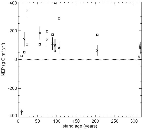 Figure 4. Simulated NEP as a Function of Stand Age in Ponderosa Pine (Crosses, Vertical Bars Show One Standard Deviation Range of Climate-driven Interannual Variability). Observed values shown for comparison (squares).