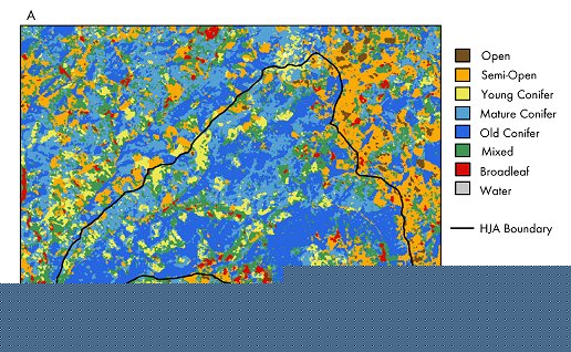Scaling Issues Evaluated at the H.J. Andrews LTER Site. In this study, a fine scale (25 m grid) analysis of NEP over a 164-km2 area of the H.J. Andrews Long-Term Ecology Research (LTER) site, where coniferous forests are some of the most productive in the Pacific Northwest Region (Turner, et al., 2002). We evaluated the effects of including fine scale information in landscape-scale NEP assessments. The Enhanced Thematic Mapper (ETM+) sensor resolved five cover classes in the study area and further differentiated between young, mature, and old-growth conifer stands (see Figure 5). ETM+ also was used to map current leaf area index (LAI) based on an empirical relationship of observed LAI to spectral vegetation indices. A daily time step climatology, based on 18 years of meteorological observations, was distributed (1 km resolution) over the mountainous terrain of the study area using the DAYMET model. Estimates of carbon pools and flux associated with soil, litter, coarse woody debris, and live trees then were generated by running the Biome-BGC model to a state that reflected the current successional status and LAI of each grid cell, as indicated by the remote sensing observations. Estimated annual NEP for 1997 over the complete study area averaged 230 gCm-2 with most of the area acting as a carbon sink (see Figure 6). The area-wide NEP strongly is positive because of reduced harvesting in the last decade and the recovery of areas harvested between 1940 and 1990. The average value was greater than would be indicated if the entire area was assumed to be a mature conifer stand, as in a coarse scale analysis. The mean NEP varied interannually by more than a factor of two. This variation was 38 percent less than the interannual variation for a single point. The integration of the process model with ground surface information provided by remote sensing offers a framework for investigating mechanisms regulating NEP and evaluating coarse resolution globally-applied NEP scaling efforts.