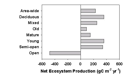 We submitted a paper to Global Change Biology for publication, entitled "Changes in carbon storage and fluxes in a chronosequence of ponderosa pine." The paper evaluates differences in carbon budget components across 12 stands ranging from 9 to greater than 300 years. NPP, heterotrophic respiration, and net ecosystem production (NEP) were lowest in young stands, highest in stands from 100 to 150 years old, and slightly lower in stands greater than 200 years old (see Figure 4). NEP averaged 141 g cm-2 y-1 (SD 111). Carbon storage in live mass reached a maximum of 17.4 kg cm-2 by age 150 to 200, and was not lower in older stands, contrary to the belief that mortality leads to decreased live mass of old stands. Total ecosystem carbon storage and the fraction of ecosystem carbon in aboveground wood mass increased rapidly until 150 to 200 years, and also did not decline in older stands. Forest inventory data (FIA, CVS) on 950 ponderosa pine plots in OR showed that the greatest proportion of plots exist in stands approximately 100 years old, indicating that a majority of stands are approaching maximum carbon storage and net carbon uptake. Our data suggest that NEP averages approximately 150 g cm-2 y-1 for ponderosa pine forests in OR. About 85 percent of the total carbon storage in biomass on the survey plots exists in stands greater than 100 years, which has implications for managing forests for carbon sequestration.