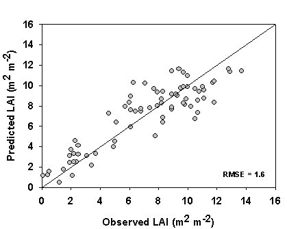 Figure 7. ETM+ Predicted Versus Observed LAI From Field Data in the H.J. Andrews LTER Site in the Cascade Mountains.