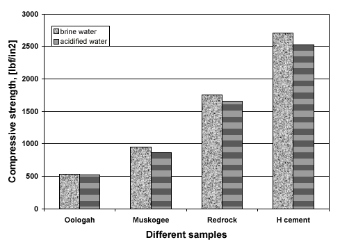 These tests were performed only as reference to verify that the compressive strength of fly ash samples was over 500 psi under these extreme conditions, which should be an acceptable requirement as a plugging material. Figure 3 illustrates that even under acidified condition, which is the most severe situation, the fly ash samples do not reduce their strengths significantly. Red Rock sample showed the highest compressive strength among the fly ash sources.