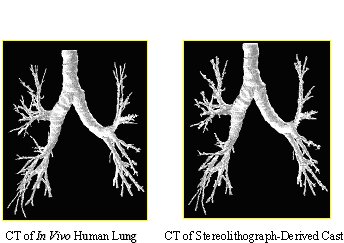 The success of the original PM Center project is demonstrated in the figures below. Figure 1 shows computed tomography (CT)-based images of an in vivo human lung and the derived cast. Derived airway measurements are compared in Figure 2.