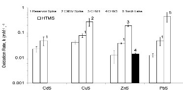 There is approximately an order of magnitude variation among various sediment types. The oxidation rate is always faster than the HTMS for the MS. There also is a trend of increasing oxidation rate CdS < CuS < ZnS < PbS. The results of these experiments are used in the modeling analysis.