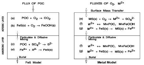 The structure of the model is presented in Figure 1. The features incorporated in the model are: the oxidation of POC in the aerobic layer using oxygen (a) and in the anaerobic layer using sulfate (c); the formation (d) and oxidation (b) of iron sulfide (FeS(s)); the formation (g) and oxidation (e) of MS(s) as a source and sink of dissolved metals, respectively; partitioning of metals (f) to iron oxyhydroxide (FeOOH) and POC; and particulate and diffusive mixing to model bioturbation and pore water diffusion, respectively. Experiments are being carried out to support the model development. The oxidation kinetics of the MS are being determined for pure phase MS and from naturally contaminated sediments. A series of experiments are being