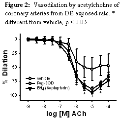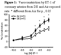 The lack of a clear synergism between the two conditions (DE exposure and IH) led us to focus on the effects of diesel alone in control rats. We observed that following exposure to DE, ET-1 constriction was greatly augmented and endothelium-dependent dilation was profoundly decreased (Figure 1). Studies this year have focused on identifying the mechanism for that change