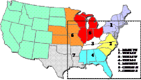 This project is a modeling study and as such requires considerable preanalysis activity. The Electric Power Research Institute (EPRI) is coordinating its model development effort with Ted Russell at Georgia Institute of Technology, who has done similar work with the Sparse Matrix Operator Kernel Emissions (known as SMOKE)/Community Multi-Scale Air Quality (CMAQ) model. EPRI has obtained from VISTAS Fifth Generation Mesoscale Model (MM5) output files (MMOUT files) that cover the period from December 17, 2001, to the end of 2002. The output files are for the second domain (181 x 190 grid points) with a horizontal resolution of 12 km and 34 vertical levels. These data were transferred to Darko Koracin, from the Desert Research Institute (DRI), who will use them in the trajectory-based receptor modeling analysis. EPRI collaborators, Eladio Knipping and Naresh Kumar, will produce synthetic IMPROVE data from the National Emissions Inventory (NEI) for PM2.5, SO2, NH3, NOx, and volatile organic compounds using the CMAQ model and MM5 output from 2002 for a domain encompassing the eastern half of the country. The domain in Figure 1 is divided into seven regions representing Regional Planning Organizations and subsets thereof.