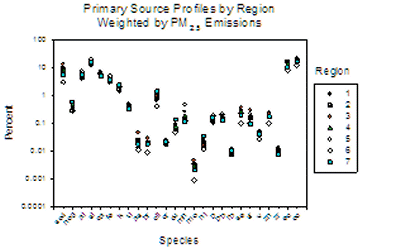 There is very little regional variation in primary PM2.5 emissions, although SO2 emissions are considerably higher in Region 5 (Midwest). Although regional emissions may be similar, regional contributions to the receptors should vary temporally depending on meteorological variation. Regional source profiles were created by averaging individual source types (e.g., coal and oil combustion, mobile, manufacturing) profiles with IMPROVE chemical species on a PM2.5 emission-weighted basis. The seven regional source profiles are compared in Figure 3.
