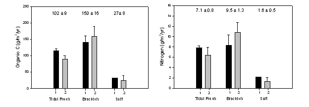 Field sites were selected along three river-dominated estuaries (Altamaha, Ogeechee, Satilla Rivers) along the Georgia coast in July 2005. On each estuary, six tidal marshes (two tidal fresh-, two brackish-, and two salt-water marshes) were selected for sampling. Two soil cores (levee, plain), 0-60 cm in length, were collected at each wetland for a total of 36 cores. Cores were processed and are being analyzed for bulk density, 137Cs, 210Pb, organic carbon (C), nitrogen (N), and phosphorus (P) to determine rates of C sequestration, N and P retention, and sediment accumulation. Results from the Altamaha River estuary (six cores) are complete and indicate that tidal fresh- and brackish-water marshes sequester C at rates that are three to four times greater than salt marshes (Figure 1a). Tidal fresh- and brackish-water marshes also exhibit higher N retention than salt marshes (Figure 1b). Laboratory analysis of soils from the Ogeechee and Satilla Rivers is underway to determine sediment and nutrient accumulation in marshes within these estuaries.