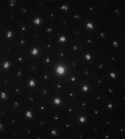 Figure 2. FeOOH(goethite) Synthesized For Use in Dissolution Experiments. (A) High resolution transmission electron microscope image. (B) Single crystal X-ray diffraction pattern.