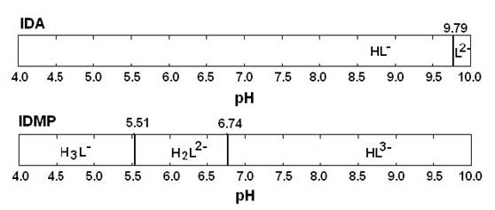 Let us suppose that one metal ion and one chelating agent have been selected. Depending upon their relative concentrations and the system pH, several stoichiometries are possible. In the chemical reactions below, we show the formation of the 1:1 and 1:2 complexes between Ni(II) and the tridentate chelating agent IDA2-.