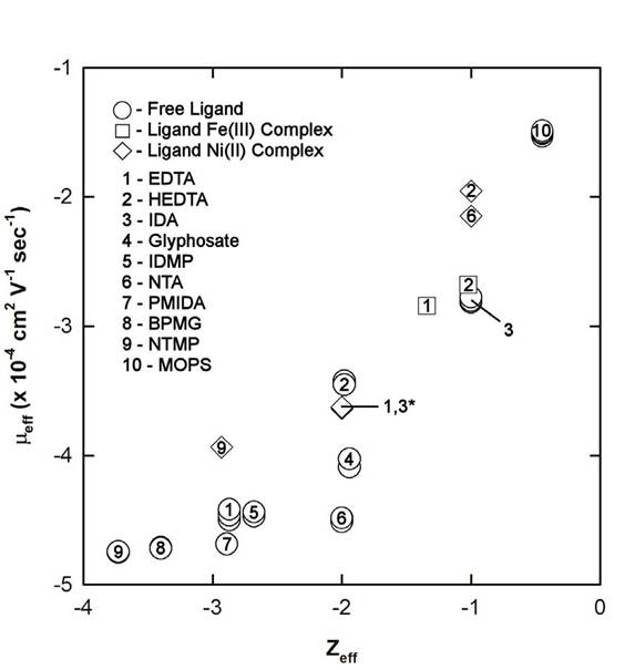 Figure 4. Electrophoretic mobilities (µeff) as a function of effective molecular charge (Zeff) for free chelating agents (circles), Fe(III)-chelating agent complexes (squares) and Ni(II)-chelating agent complexes (diamonds). Entries for metal-ion chelating agent complexes refer to 1:1 complexes, except those marked with an asterisk (*), which possess a 1:2 stoichiometry. Sample solutions contained 100 µM metal ion (where applicable), 500 µM chelating agent, 5 mM MOPS buffer (pH 7.1), and 10 mM NaNO3. The CE capillary had a total length of 40 cm, a length to the detector of 27.8 cm, and an inner diameter of 75 microns. The CE electrolyte consisted of 25 mM phosphate (pH 7.2) and 0.5 mM TTAB. An applied voltage of 25 kV was used.
