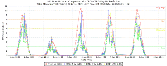 Erythema and UV Index Calibration Verification: In addition to erythema and UV index from the Brewer spectrophotometer at each of the sites, erythema and UV index can be derived from the co-located UV broadband radiometer. Solar zenith angle dependent erythema calibration factors were applied to the UV broadband radiometers to calculate an erythemally weighted solar irradiance. The comparison between the two instruments has been made available on the NEUBrew web-site (http://www.esrl.noaa.gov/gmd/grad/neubrew/. The accuracy of the calibration of the broadband radiometers for erythema used for this work was verified in an intercomparison between international UV calibration facilities [Hulsen et al., 2008]. Results indicated a difference of 0.2% at high sun from the Physikalisch-Meteorologisches Observatorium (PMOD) calibration reference in Davos, Switzerland.