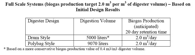 Phase I prototype digesters demonstrated the feasibility of biogas generation, using simple materials such as trash cans, oil drums, and polyethylene bags – a full scale digester, based on prototype biogas production volumes, range from 5000 to 9000 liters, depending on the design implemented (fixed drum or polybag). This digester volume is projected to meet the cooking needs of a typical Ecuadorian family of six, 2m3/day.