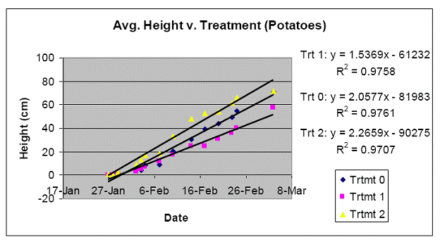 For both potatoes and grasses, plant heights were measured and recorded. The averages of the heights for each test group (control, low application, and high application) were recorded. The dry weights of plant material were also recorded to determine yield differences. There is a clear growth difference for potato applications, and there was also a 132% and 131% yield difference over control for low and high applications of digested sludge, respectively. The growth data for pasture grass showed no significant results, however yield data indicated a clear difference. There was a 51% difference between the control group and low application yields for pasture grasses, and an 80% difference between the control group and high application group yields. There is a community cost savings of $2.59 - $5.17 per acre ($6.40 - $12.78 per hectare).