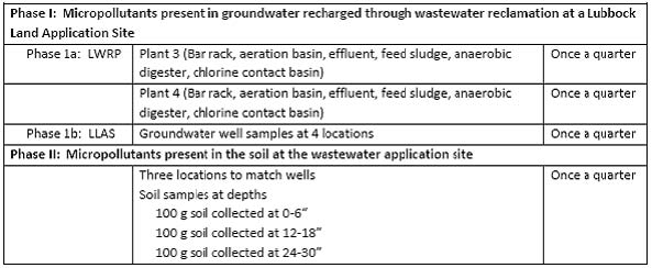 Table 4 summarizes the sample collection during each phase of the project. Note that all samples will be analyzed for the micropollutants to be studied in this project (17ß-estradiol (E2), estrone (E1), estriol (E3), and 17a-ethinylestradiol); ciprofloxacin; ibuprofen and triclosan).